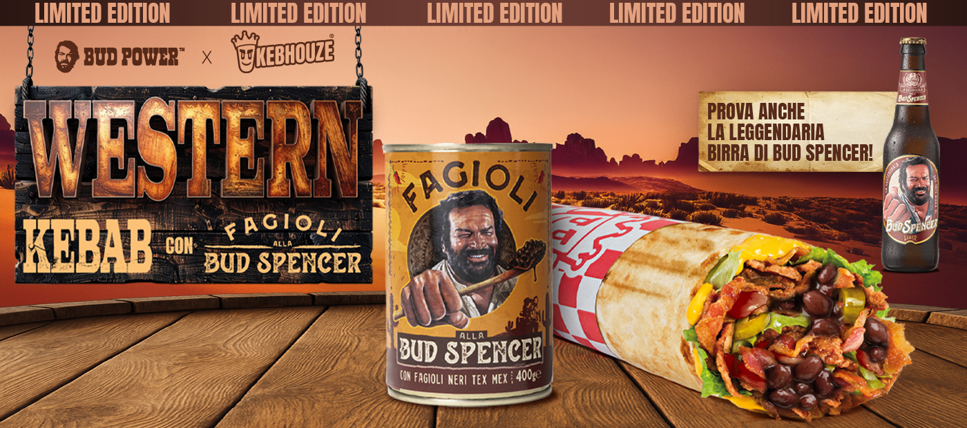 Grazie alla collaborazione con Bud Power, puoi finalmente assaporare il nostro kebab con i famosi fagioli Tex Mex alla Bud Spencer e la Leggendaria Birra di Bud Spencer.